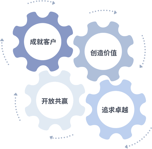 成就客户是一切决策的出发点,,,,创造价值是衡量所有工作的标准,,,追求卓越是亚星会员yaxin222.com做事做人的态度,,,,开放共赢是亚星会员yaxin222.com的格局也是最终的结果。。。。价值观的齿轮环环相扣,,推动着组织里的每个人不断向前。。